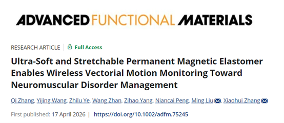 近日,该研究以《超柔可拉伸永磁弹性体实现无线矢量运动监测用于神经肌肉疾病管理》(Ultra-Soft and Stretchable Permanent Magnetic Elastomer Enables Wireless Vectorial Motion Monitoring Toward Neuromuscular Disorder Management)发表在《先进功能材料》(Advanced Functional Materials),西安交通大学生命科学与技术学院张晓慧教授、西安交通大学电子学院刘明教授为该论文通讯作者,生命科学与技术学院毕业博士研究生张淇为本文的第一作者(现为甘肃中医药大学医学信息工程学院副教授)。本研究得到了国家自然科学基金、国家重点研发计划等项目的资助。