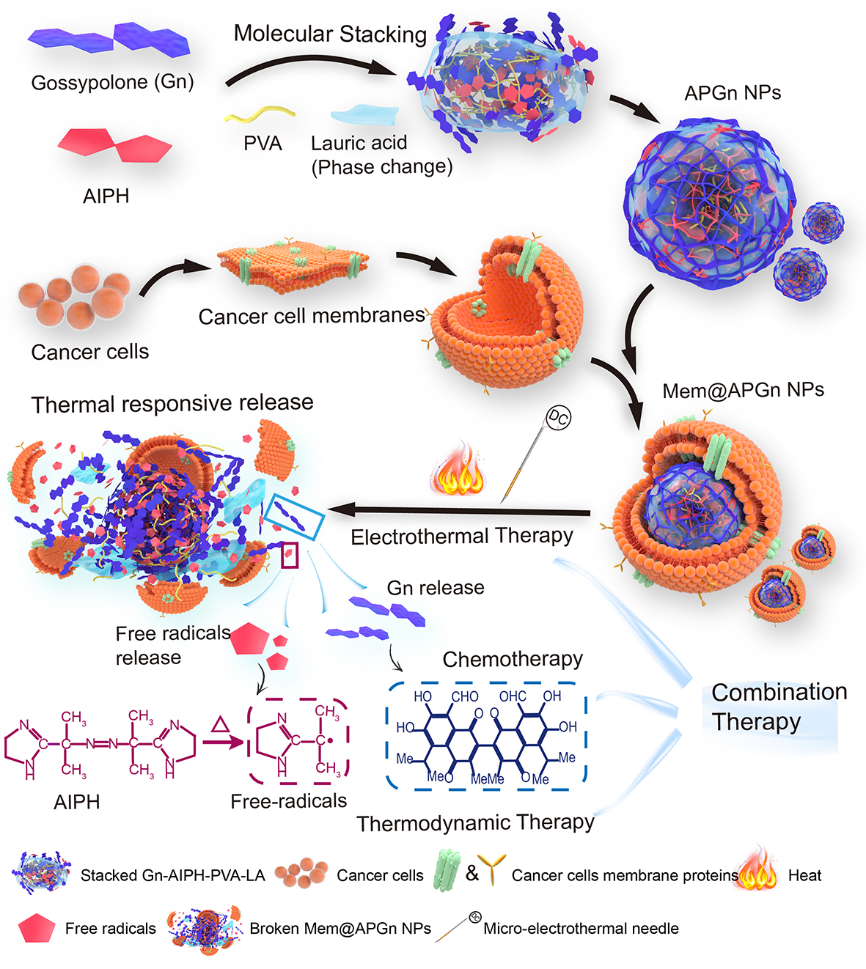 根据肿瘤热动力治疗的要求,课题组利用上述这种具有局部精确控温性能的微电热针(Micro-electrothermal needle,MEN)作为肿瘤热疗和热动力治疗的加热系统,该系统可以控制肿瘤部位温度在(T±7°C)20分钟以上。在此基础上提出了电热/热动力/化疗三模态协同治疗新策略。将化疗药物棉酚酮(Gn)、热力学试剂(2,2'-偶氮双[2-(2-咪唑啉-2-基)丙烷]二盐酸盐,AIPH)分子堆砌成纳米粒,其中掺杂少量聚乙烯醇和温敏相变材料月桂酸,再将肿瘤细胞膜修饰在表面形成分子堆积复合纳米粒子(APGn@MemNPs)(图2)。该复合纳米粒子尺寸为65±9.8nm,不仅载药量高、毒性低,还具有同源肿瘤靶向及热响应药物释放性能。