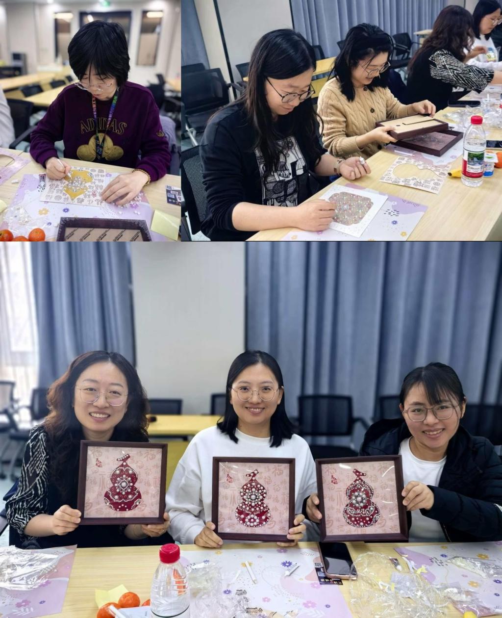 从构图设计到颜色搭配,从细节粘贴到整体装饰,老师们兴致盎然、巧手翻飞,原本普通的材料,在巧思妙手中逐渐化作一幅幅精致灵动、独具韵味的宋锦珍珠画作品。